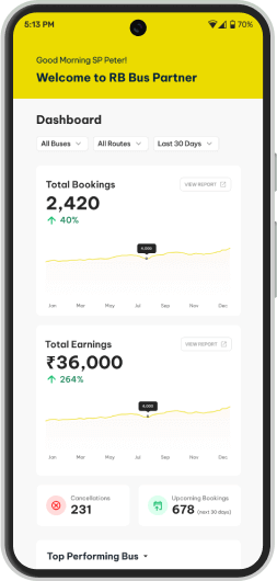 Download NowA real-time dashboard provides critical insights including total bookings, revenue, cancellations, and top-performing buses. It also predicts today's expected bookings based on historical trends.